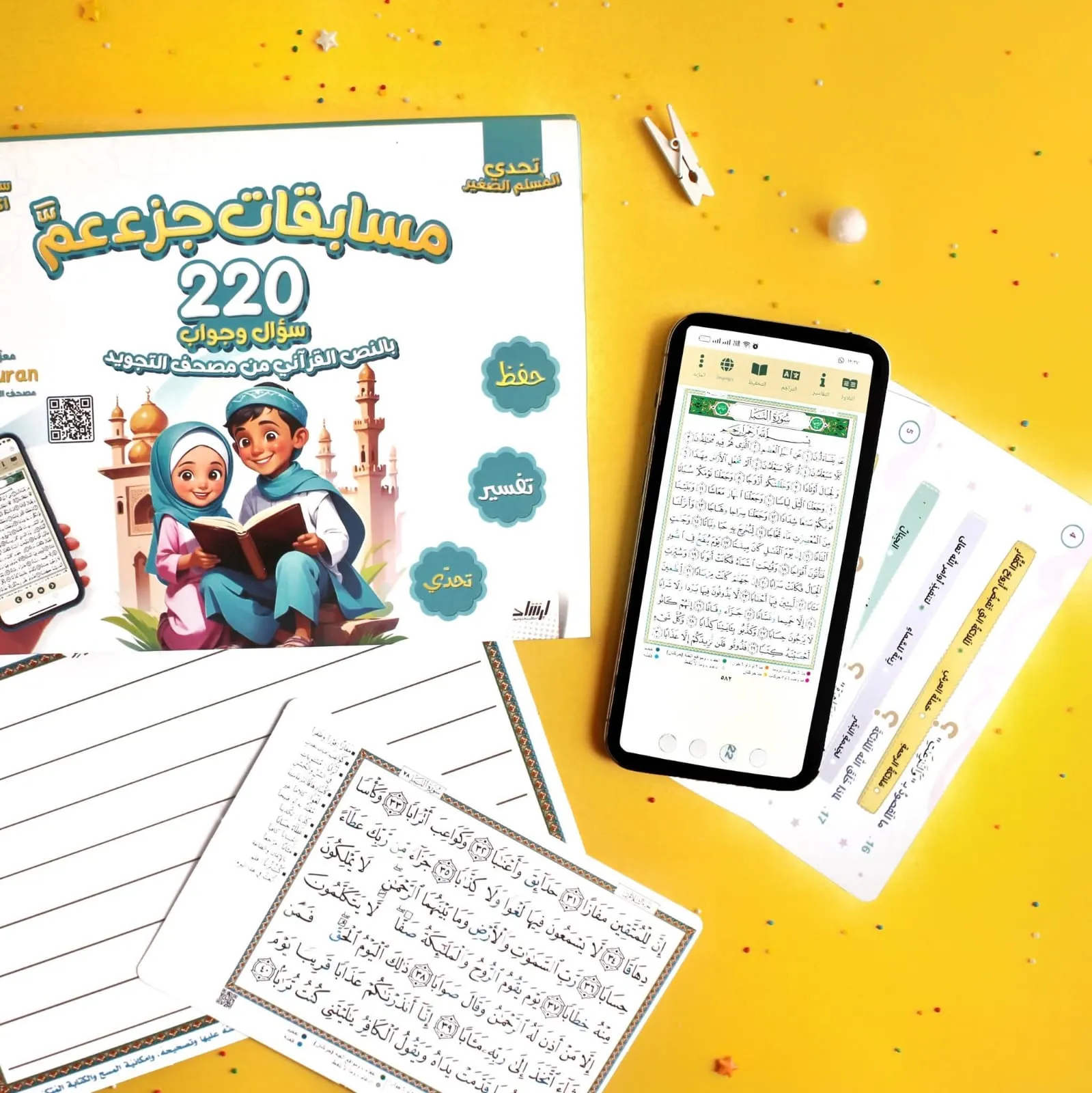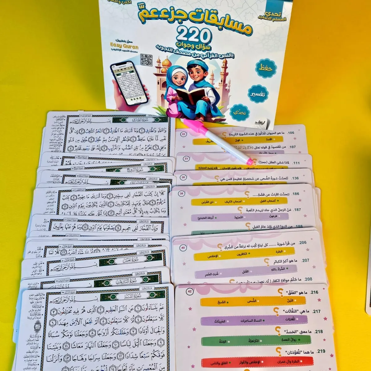 بوكس مسابقات القرآن = 220 سؤال وجواب يخلّي الأطفال تلعب وتفهم وتستفيد… ومعاهم سبورة وقلم للمنافسة + محتوى تجويد وغريب كلمات + QR للاستماع والتفسير 11 لغة.