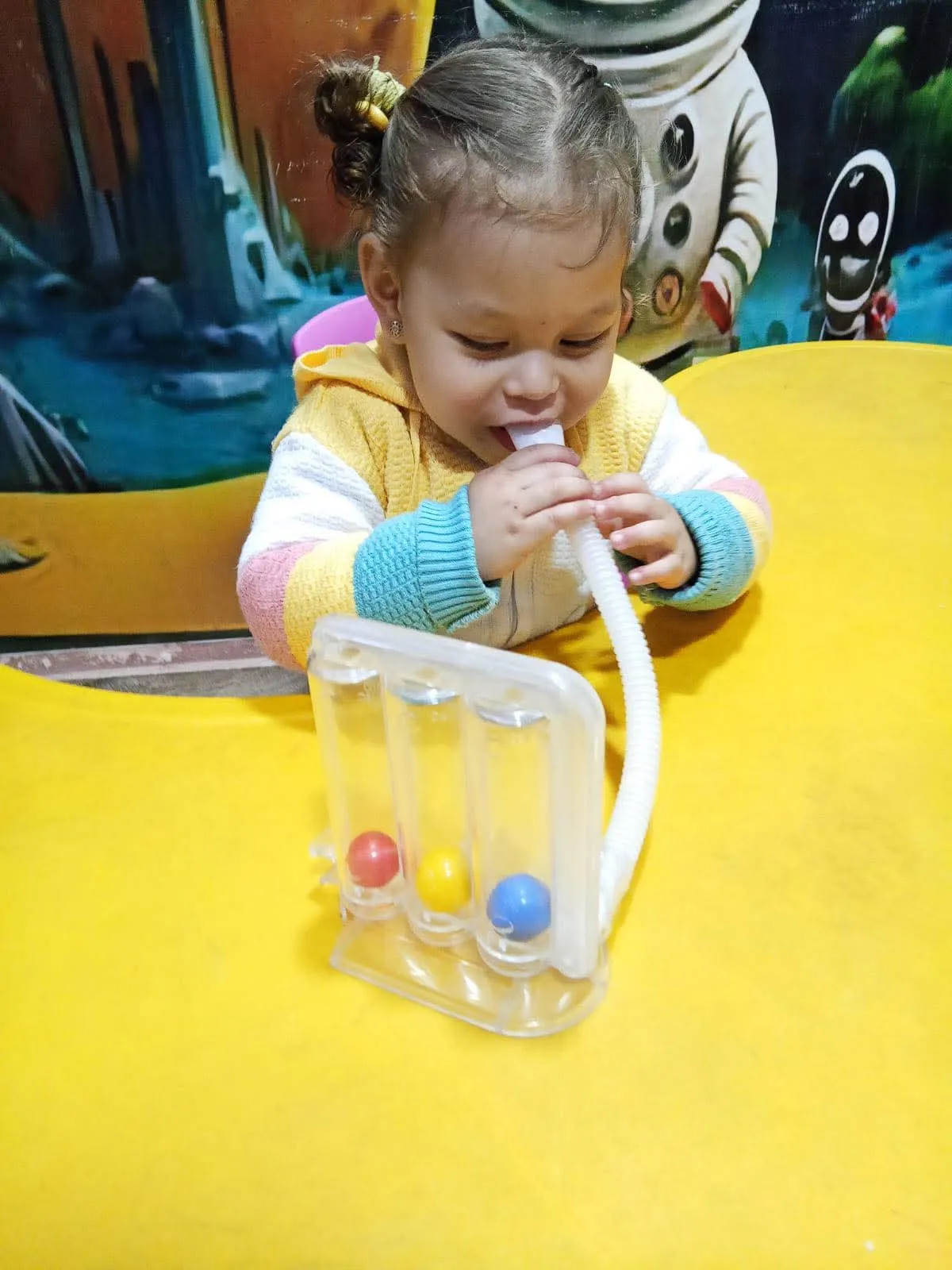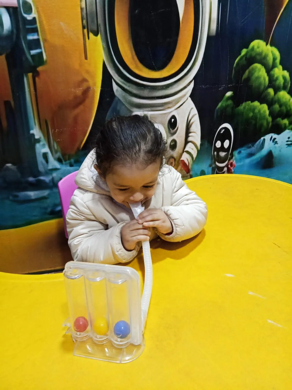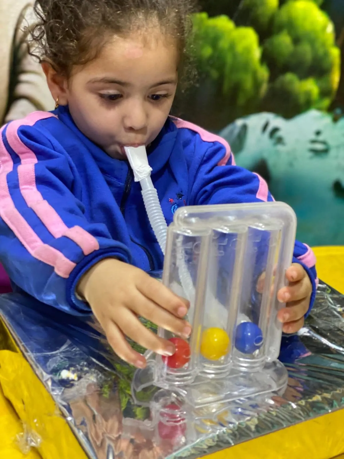 الطفل ينفخ/يشُفط من الأنبوبة حسب التمرين.